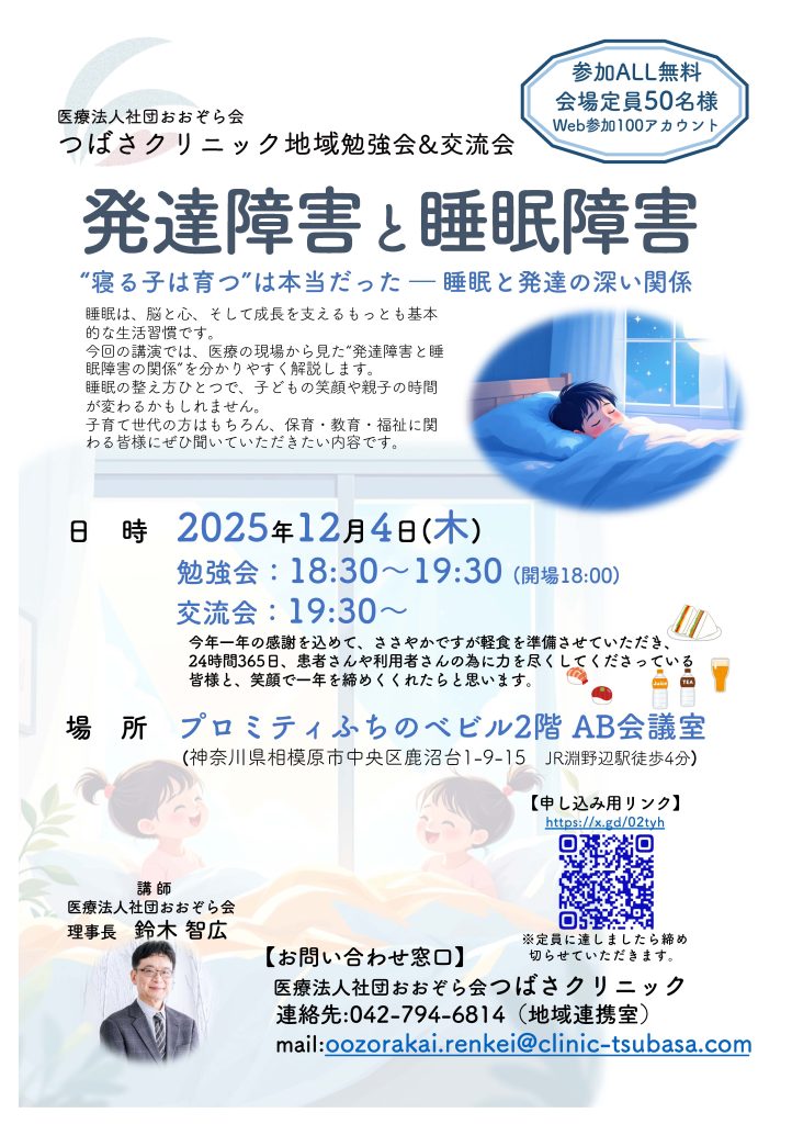 医療法人社団おおぞら会 つばさクリニックでは、地域の子どもたち・ご家族・支援者の皆さまや、保育・教育・福祉・医療に関わる皆さまを対象に、以下のとおり「地域勉強会&交流会」を開催いたします。